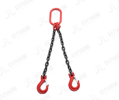 双腿链条成套索具是以金属链环连接而成的索具,按照其形式主要有焊接和组装两种,其突出特点是耐磨、耐高温、延展性低、受力后不会伸长等。使用寿命长,易弯曲,适用于大规模、频繁使用的场合。